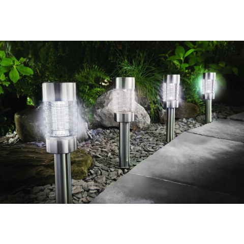 Rozsdamentes acélból és üvegből készül, mérete 6,2 x 41,5 cm (dxi) és IP44 védettségi fokú, amely ellenáll a környezeti tényezőknek. Ha a lámpát legalább 6 órán keresztül kívül, napos helyeken helyezi el, a napeleme 6-8 órán keresztül világíthat. Söt
