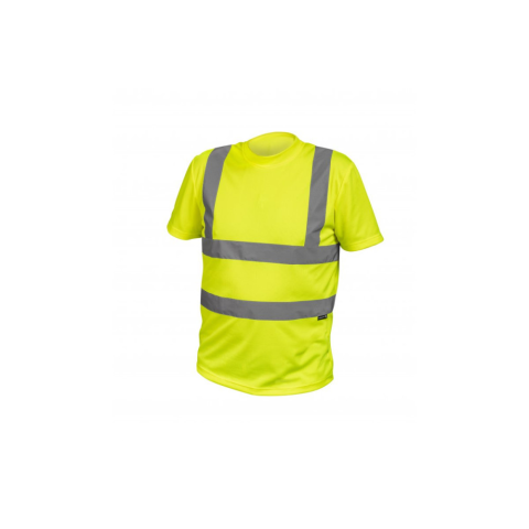 Jól látható póló. Kiváló minőségű poliészterből készült, amely légáteresztő és kellemes tapintású. A laza fazon nem feszesíti a figurát és teljes mozgásszabadságot biztosít. A póló rövid ujjú, kerek nyakkivágással (U-alakú). A póló 2 fényvisszaverő csíkka