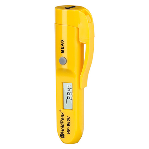 HoldPeak mini infravörös hőmérsékletmérő A hőmérsékletmérő főbb tulajdonságai Rendkívül kicsi méretű, akár zsebben is hordható lézer infravörös hőmérséklet mérő, felületi hőmérséklet gyors, ellenőrző mérésének elvégzésére. Lézeres infravörös hőmérsékletérzékelő. Mérési tartomány: -30°C - +275°C, -22°F - +527°F. Mérési pontosság: 0.4°C. Optimális tesztelési távolság: 2-3 cm. Mérési idő: 500 ms. Emisszió: 0.95. Ajá
