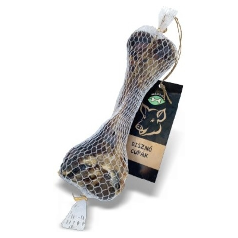 A szárított, füstölt disznó lábszárcsont hosszan tartó, ízletes jutalomfalat kutyák számára. Nem tartalmaz tartósítószert, mesterséges színezőanyagot vagy adalékanyagokat. Rágás közben hatékonyan tisztítja a fogakat és erősíti a rágóizmokat. Közepes és kistestű kutyák számára ajánlott. Etetési javaslat: jutalomfalatként, felügyelet mellett adható.