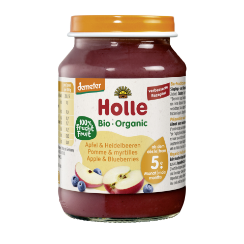Holle bio bébiétel alma-feketeáfonya 190 g A Holle bio gyümölcsös bébiételek a legfinomabb gyümölcs alapanyagokból készülnek cukor hozzáadása nélkül. Egészséges és ízlik a babának. Összetevők: alma (50 %), víz, sűrített almalé 10 %, fekete áfonya 7,5