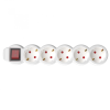 Az NV 5K-3/WH/1,5 Kapcsolós hálózati elosztó 5 db aljzattal ellátott, melyet egy fő kapcsolóval áramtalanítani tud. A biztonságos használat érdekében IP 20 védelemmel és gyermekvédelemmel ellátott. A fehér színű elosztó 3 m hosszú H05VV-F 3G1,5 mm2 kábell