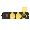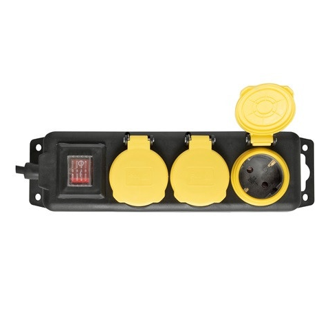 Az NVO 03K/BK Hálózati elosztó kapcsolós, masszív, kültéri kivitelben készült 1,5 m hosszú H05RR-F 3G1,0 mm² fekete gumikábellel. A termék IP 44 védettségű, a zárófedeles aljzatok által kültéren is biztonsággal használható. Az elosztó 3 db gyerekvédelemme