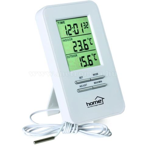 A Home vezetékes külső-belső hőmérő órával (HC 12) a maximum és a minimum értékeket is kijelzi. Beltéri hőmérséklet kijelzés -9°C- +50°C, a kültéri hőmérséklet kijelzés -50°C- +70°C. A vezetékes hőmérő szonda 1,4 m hosszú. A hőmérő elhelyezhető állítva asztalra vagy falra akasztva egyaránt. A kijelző mérete 41 x 53 mm. Tápellátása 2 x 1,5 V (AAA) elemmel történik, amely nem része a csomagnak.