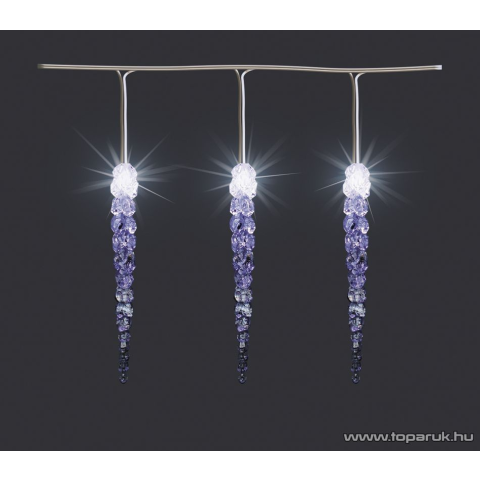 - 50 db hidegfehér LED - 15 cm-es jégcsap dekoráció a LED-en - kül- és beltéri felhasználhatóság - tápellátás: 230 V~/24 V adapter Méretek: - Hálózati vezeték hossza: 5 m - Fényfüzér hosszúsága: 7,3 m - Jégcsapok közötti távolság: 15 cm - Jégcsapok l