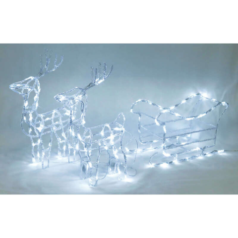 Karácsonyi LED-es rénszarvasok szánnal - 120 LED fény 🎄 Varázsolja el otthonát ezzel a gyönyörű, kültéri LED-es karácsonyi dekorációval! Két aranyos rénszarvas húzza a csinos szánt, melyet 120 meleg fehér LED fény tesz igazán ünnepivé. A dekoráció i...