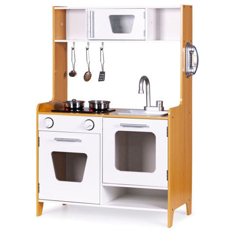 GYERMEK FA KONYHA KIEGÉSZÍTŐKKEL 3 év feletti gyermekek számára Stabil, masszív szerkezet Hangeffektek és megvilágított égők Forgó, kattanó gombok Nyitott sütő, mikrohullámú sütő, szekrény További, fém főzőkiegészítők Az ECOTOYSmárka terméke