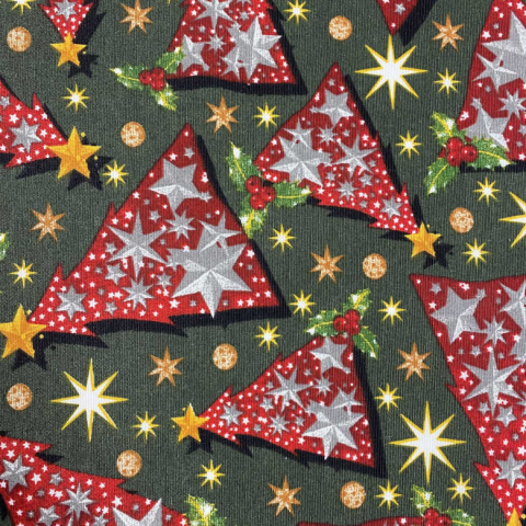 Karácsonyi dekorvászon, lakástextil méteráru. Legkisebb rendelési mennyiség 1 méter. Karácsonyi, téli mintás, 140 cm széles, pamut-poliészter, struktúrált felületű, lakástextil, vászon anyag. Csillagokkal díszitett bordó karácsonyfák, sötét olajzöld al