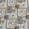 55% pamut - 45% poliészter lakástextil, dekorvászon méteráru. Legkisebb rendelési mennyiség 1 méter. 140 cm széles lakástextil, dekorvászon - minőségi spanyol termék. Bézs alapon bélyeg és kör formákban szürke és narancssárga pipik és tojások. Régie