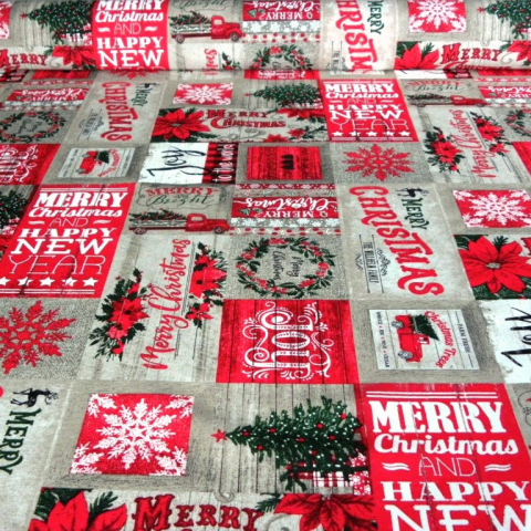 Karácsonyi dekorvászon, lakástextil méteráru. Legkisebb rendelési mennyiség 1 méter. Karácsonyi, újévi mintás, 140 cm széles, pamut-poliészter, struktúrált felületű, lakástextil, vászon anyag. Vintage minták, Happy new Year, Merry Christmas, Joy felira
