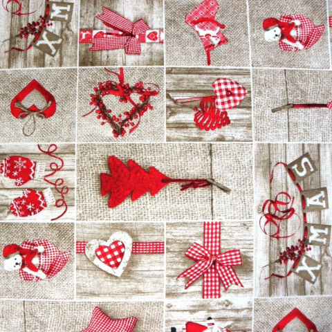 Karácsonyi dekorvászon, lakástextil méteráru. Legkisebb rendelési mennyiség 1 méter. Karácsonyi mintás, 140 cm széles, pamut-poliészter, struktúrált felületű, lakástextil, vászon anyag. Naturális, rusztikus - zsákvászon, deszka mintás alapon, piros kar