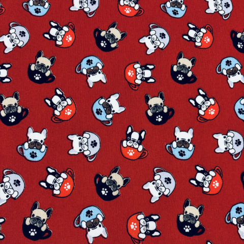 55% pamut - 45% poliészter méteráru, 140 cm széles. Legkisebb rendelési mennyiség 1 méter. 140 cm széles loneta lakástextil, dekorvászon - extra minőségű spanyol termék. Cuki kis bulldogok csücsülnek tappancs mintás kis csészékben. Piros alapszínű d