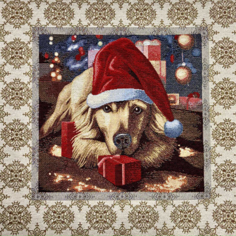 Jacquardszövött, lakástextil darabáru. 47 x 47 cm méretű panel, díszpárnához. 47 x 47 cm méretű panel, lakástextil, vászon anyag. Spanyol, egyedi designer termék. Kellemes fogású, erős dekorvászon, bútorvászon. Mikulás sapkás fekvő kutya és ajándék