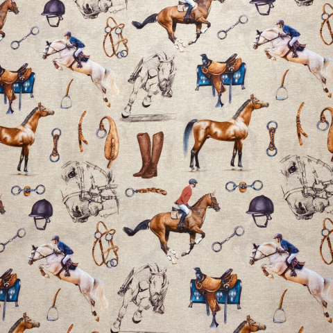 1 kép HomeTextiles LOVASSPORT, ló, lószerszám mintás, bézs loneta dekorvászon