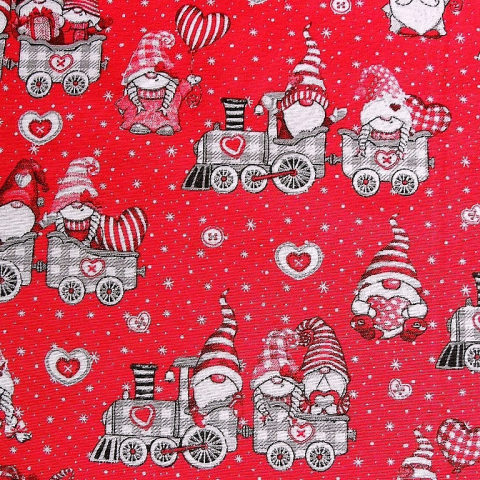 Karácsonyi dekorvászon, lakástextil méteráru. Legkisebb rendelési mennyiség 1 méter. Karácsonyi, vonatozó manócskák mintás, 140 cm széles, pamut-poliészter, struktúrált felületű, lakástextil, vászon anyag. Kiváló minőségű, spanyol termék. Kellemes fo