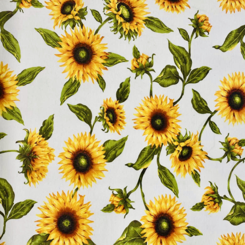 55% pamut - 45% poliészter lakástextil, dekorvászon méteráru. Legkisebb rendelési mennyiség: 1 méter. 140 cm széles lakástextil, dekorvászon - minőségi spanyol loneta termék. Fehér alapon szépséges napraforgók, mindenféle formában. Összetétel: 55% pa