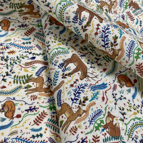 55% pamut - 45% poliészter lakástextil, dekorvászon méteráru. Legkisebb rendelési mennyiség 1 méter. 140 cm széles lakástextil, dekorvászon - extra minőségű spanyol termék. Törtfehér alapon őzikék, rókák alszanak, álldogálnak, közöttük szép rajzolt á