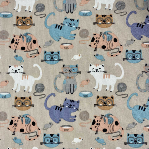 55% pamut - 45% poliészter méteráru, 140 cm széles. Legkisebb rendelési mennyiség 1 méter. 140 cm széles loneta lakástextil, dekorvászon - extra minőségű spanyol termék. Pasztell árnyalatú cicák, szemüveges cicafejek, egérkék, tányérkák, gombolyagok b