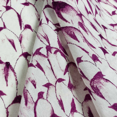 55% pamut - 45% poliészter méteráru, 140 cm széles. Legkisebb rendelési mennyiség 1 méter. 140 cm széles loneta lakástextil, dekorvászon - extra minőségű spanyol termék. Sok-sok lilás bíbor színű pingvin törtfehér alapon. Festett hatású dekorvászon