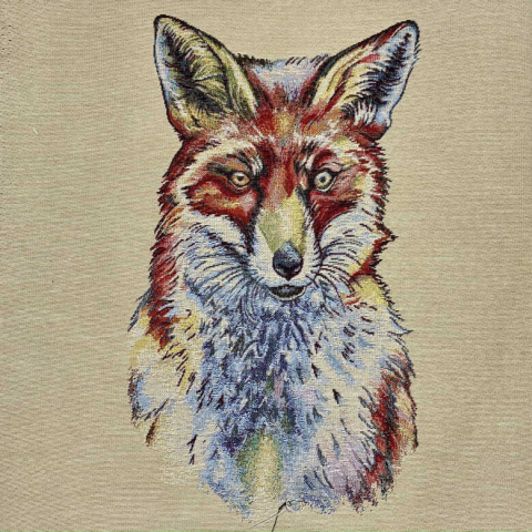 Jacquardszövött, lakástextil darabáru. 47 x 47 cm méretű panel, díszpárnához. 47 x 47 cm méretű panel, lakástextil, vászon anyag. Spanyol, egyedi designer termék. Kellemes fogású, erős dekorvászon, bútorvászon róka mintával. Összetétel: 55% pamut - 45