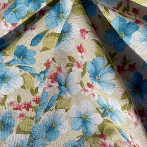 55% pamut - 45% poliészter lakástextil, dekorvászon méteráru. Legkisebb rendelési mennyiség: 1 méter. 140 cm széles lakástextil, dekorvászon - minőségi spanyol loneta termék. Alapszín: bézs. Kék színű törcsérvirágok és pici rózsaszín-piros virágok, le