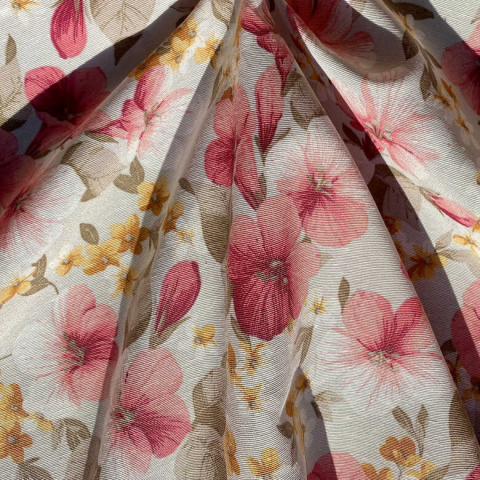 55% pamut - 45% poliészter lakástextil, dekorvászon méteráru. Legkisebb rendelési mennyiség: 1 méter. 140 cm széles lakástextil, dekorvászon - minőségi spanyol loneta termék. Alapszín: bézs. Rózsaszín törcsérvirágok és pici sárga virágok, levelek bézs