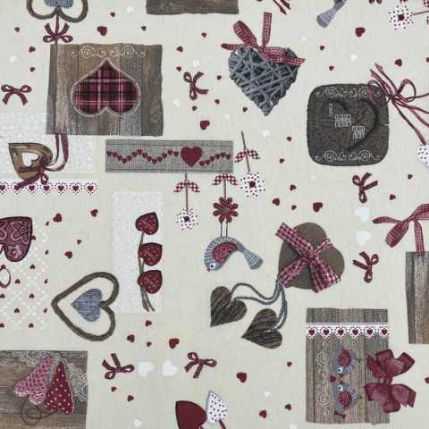 55% pamut - 45% poliészter lakástextil, dekorvászon méteráru. Minimum rendelési mennyiség 1 méter. 140 cm széles lakástextil, dekorvászon - extra minőségű spanyol termék. Összetétel: 55% pamut - 45% poliészter. Szív, szivecske, mintás lakástexti