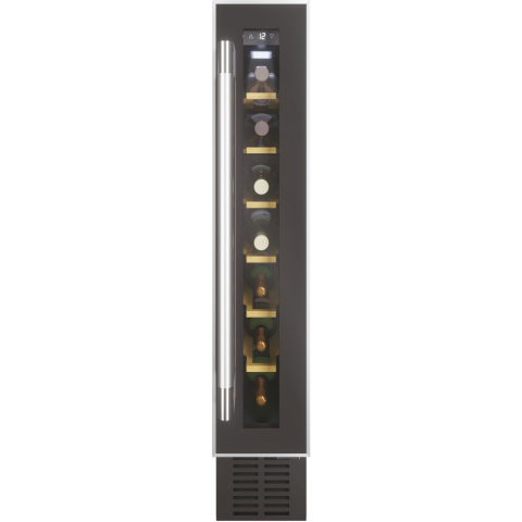 Beépíthető borhűtő - G energiaosztályú, 7 palack számára, belső térfogata 20 l, 1 hűtőzónával, 6 polcos, automatikus leolvasztás, kijelző, megvilágítás, az ajtónyitás megváltoztatásának lehetősége és kihúzható polcok, érintőképernyős és digitális vezérlés, 5-18 °C között szabályozható hőmérséklet, 39 dB zajszinttel, jobbos nyitásirány, mérete 86,5 × 14,5 × 47,5 cm (Ma×Sz×Mé), tömege 19 kg, fekete és inox színű HOOVER HWCB 15/1 H-WINE 300