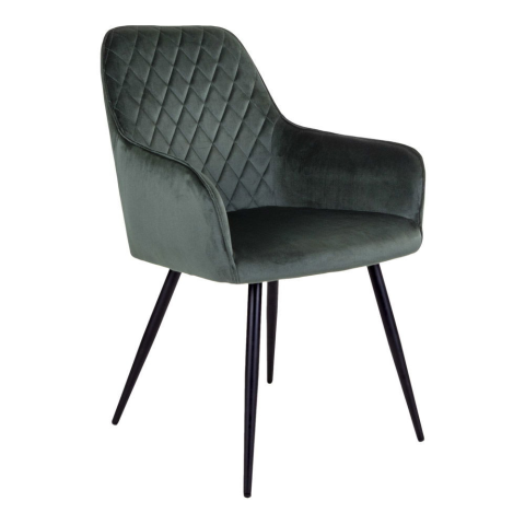 Harbo Étkezőszék – Zöld Bársony Természetes szín és elegancia A Harbo étkezőszék zöld bársony kárpitozása természetes színével nyugtató hatást kelt, míg a bársony anyag puhasága és fényes felülete eleganciát sugároz. A fekete fém lábak modern megjele