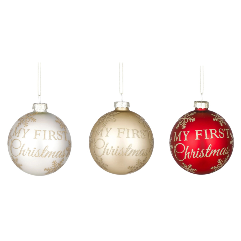 A karácsonyi díszeket a "My first Christmas" szöveg és csillogó hópelyhek díszítik. Az üveggömbök ezüst, piros és arany színben kaphatók, átmérőjük 8 cm. Kiválóan alkalmasak születési vagy karácsonyi ajándékként is. Többféle mintával / színváltozatban kapható termék. Az ár 1 db-ra vonatkozik. Online vásárlás esetén a tényleges termékváltozat véletlenszerűen kerül kiválasztásra. Válasszon tetszése szerint a legközelebbi OBI Áruházban!