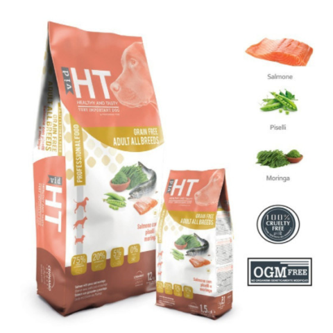 HT VID Grain Free Hipoallergén kutyatáp Adult Salmon 12kg Gluténmentes, gabonamentes, kukoricamentes, rizsmentes kutyatáp, amely monoprotein, azaz kizárólag egyféle állati fehérjét, lazacot tartalmaz. HT VID (Very Important Dog = Nagyon Fontos Kutya) M