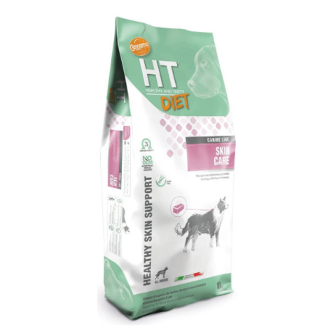 HT DIET Skin Care Gyógytáp 10 kg Gyógytáp felnőtt kutyáknak, melyet kifejezetten dermatológiai problémák és szőrhullás kezelésére fejlesztettek ki. Gazdag Omega 3-ban, így támogatja a bőr és a szőrzet állapotát. Tartalmaz FOS-t (frukto-oligoszacharidokat)