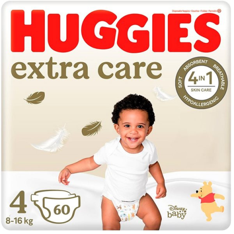 Eldobható pelenka - hagyományos pelenka, méret 4, gyermek súlya 8 - 16 kg, 60 darab a csomagban, pelenkakiütés elleni védelem, mesés motívum, Huggies Extra Care sorozat A Huggies legfinomabb pelenkája belül és kívül. A pelenka elején található egyedülálló réteg egy pillanat alatt felszívja a folyadékot. A hátsó részen lévő második speciális réteg pedig a híg széklete