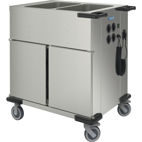 A stabil, önálló és higiénikus felépítésű kocsi kiváló minőségű rozsdamentes acélból. Zárt konstrukció, minden irányból lemezzel borított tetővel és körben lévő fröccsenésvédő peremmel.A tetőben varrat és rések nélküli, teljesen szigetelt medencék találhatók, amelyek nedvesen fűthetők, mélységi töltöttségi jelöléssel. Minden medence egy GN 1/1-200 vagy annál kisebb tárolóedény számára van kialakítva.A medence aljának speciális dőlése bizt