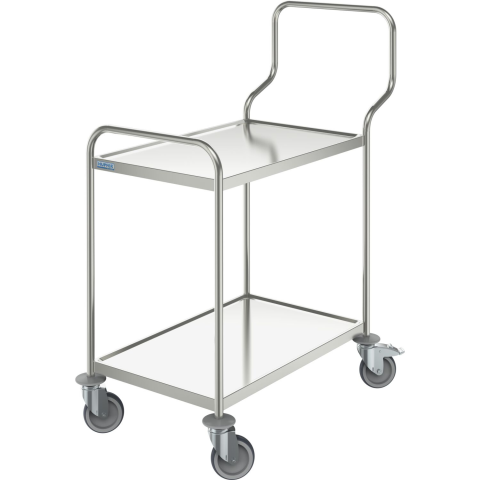 A stabil, önállóan álló és higiénikus kivitelű kocsi prémium rozsdamentes acélból készült. A 25 mm átmérőjű kerek csőkeret rögzített, mélyhúzott bordákkal rendelkezik, 10 mm magas profillal, hangszigetelő burkolattal, higiénikus 35 mm-es hajlítással és belső hajtással, tisztításra barátságos kivitelben. Kétoldali, a csőkeretbe integrált tolókarok biztosítják a könnyű manőverezhetőséget.4 darab polietilén ütközőkerék szolgál ütközésvédőként