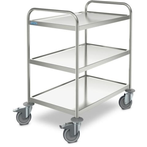 Stabil, önhordó és higiénikus szerkezetű kocsi kiváló minőségű rozsdamentes acélból. ø 25 mm-es kerek csőváz mereven hegesztett, mélyhúzott tárolópolcokkal, 10 mm magas profiléllel, hangtompító burkolattal, higiénikusan 35 mm-rel ferde és befelé hajtva, könnyen tisztítható kivitelben. A cső alakú keretbe mindkét oldalon beépített nyomómarkolatok biztosítják a könnyű kezelést.