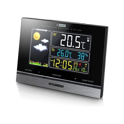 Időjárás állomás - otthoni, vezeték nélküli, rádióvezérelt csatlakozás, beltéri és kültéri használatra, előrejelzéssel és valós idejű időjáráskövetéssel, ismételt ébresztés és ébresztőóra, mért értékek: hőmérséklet, páratartalom, idő és holdállás megjelenítése, vezeték nélküli érzékelő hatótávja 30 m, maximum 1 vezeték nélküli érzékelő csatlakoztatható, önállóan használható, hálózatról és elemmel is működtethető, fő egys