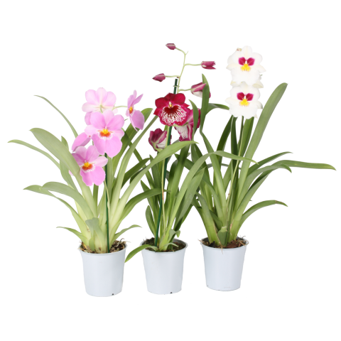 Miltonia orchidea mix 12 cm-es cserépben. Alacsony fényigényű, de tegyük világos helyre, védve a közvetlen napsótéstől. Magas vízigényű, tartsuk folyamatosan nyirkosan.Magas páraigényű, naponta kétszer ajánlott a párásítás. Éjszaka minimum 16C°-on, nappal 18-20C° körüli hőmérsékleten tartsuk. 3-4 havonta virágzik. Havi egyszeri tápoldatozás ajánlott.