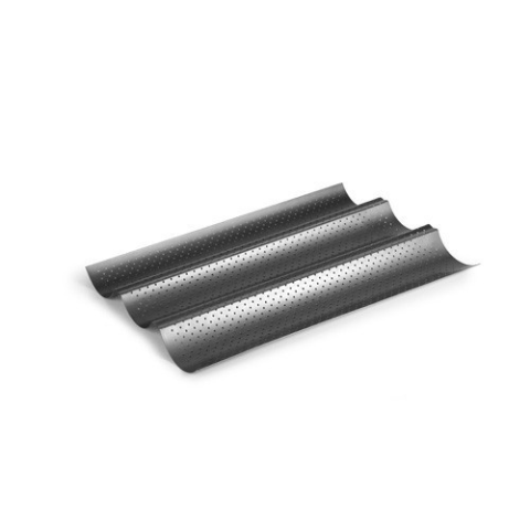 Baguette sütőforma nagy családi reggelik, házibulik hasznos segédeszköze, lyukacsos, tapadásmentes bevonatú, 38 x 24 cm-es melyben szépen megsül egyszerre 3 bagett vagy 6 mini bagett (baguette). A sütőforma speciális lukacsos kialakítása a legjobb, egy