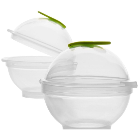 2db műanyag, 7,5cm átmérőjű jéggömb készítő forma készlet. A műanyag formákba tehetünk gyümölcs levet, gyümölcsöt, menta vagy citromfű levelet és ezt töltjük fel a forma tetején levő nyíláson keresztül vízzel, úgy hogy hagyunk a formában helyet a tágulásn