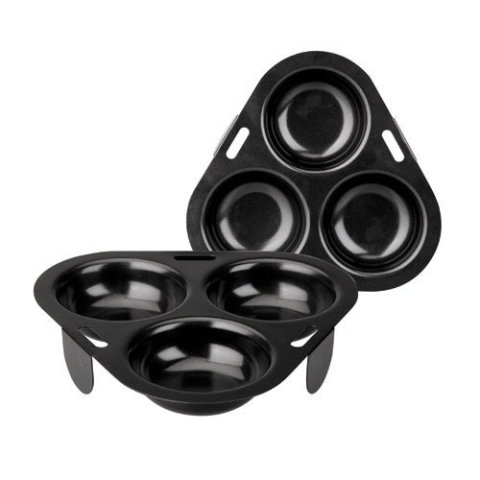 A tojás ami ezzel a formával készíthető állagát tekintve a tükörtojás és a buggyantott tojás között van és nem süléssel hanem párolással készül. A három lábon álló formát serpenyőbe állítom, ebben vizet forralok és a tojások a gőzben párolódnak meg. Az an