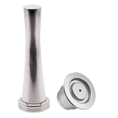 Hosszú élettartamú, őrölt kávéval tölthető rozsdamentes acél kapszula Nespresso típusú kapszulás kávéfőzőhöz + tamper.