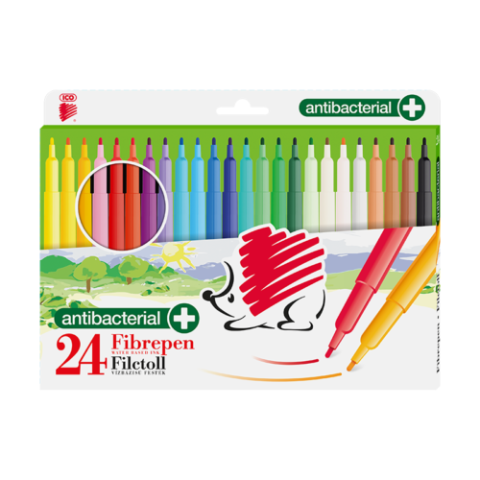 Antibakteriális rostirón vízbázisú festékkel töltve, átlevegőzős biztonsági kupakkal, rajzolásra, színezésre. A műanyag alkatrészek antibakteriális védelmet adó Biomaster ezüst-ionokat tartalmaznak (biocid hatóanyag: ezüst-foszfát üveg). Az ICO Antibakteriális termékei bizonyítottan baktériumölő tulajdonsággal rendelkeznek, a felszínen megtelepedett kórokozók 24 óra leforgása alatt, 99,9% hatékonysággal elpusztulnak. Az antibakteriális hatást az angliai In