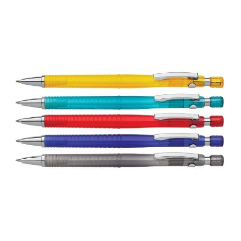 Nyomógombos mechanikával működő golyóstoll, bordázott fogórész, fémklipsz. Vidám, élénk színekben. Írásszín: kék. Íráshossz: 2500 m. Vonalvastagság: 0,8 mm. Betét: 5028601. .