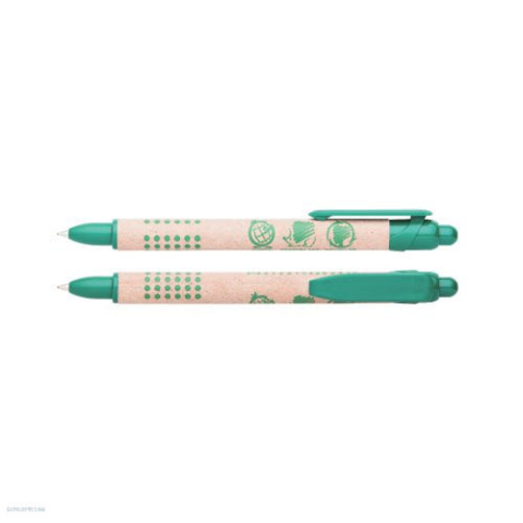 Újrahasznosított papír alapanyagú tolltest, növényi eredetű, biológiai úton lebomló alapanyagból készült kiegészítők. Mechanikus nyomógomb. Írószín: kék. Vonalvastagság: 0,8 mm Íráshossz: 2500 m .