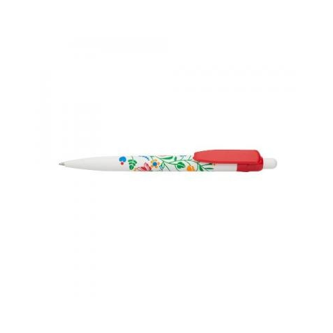 ICO Magyaros motívummal díszített, nyomógombos mechanikával működő golyóstoll. 20 db-os hengerben. Íráshossz: 2500 m, Írásszín: kék. Vonalvastagság: 0,8 mm. Betét: 50251.., X20-as.
