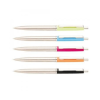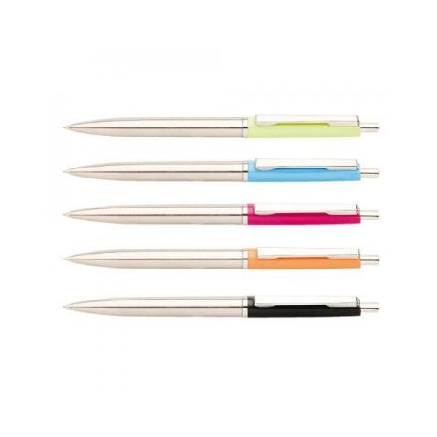 ICO Nyomógombos mechanikával működő golyósirón, cserélhető betétes. Fém fogórész, klipsz és nyomógomb, különféle színű műanyag felső tolltest. Írószín: kék. Íráshossz: 5000 m. Vonalvastagság: 0,8 mm. Betét: 50258.., ICO Silver.