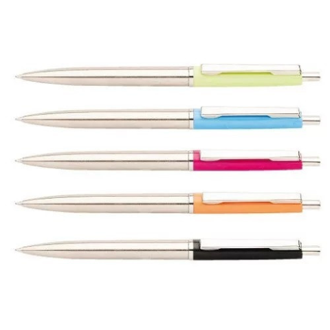 ICO X-Pen nyomógombos mechanikával működő golyóstoll, cserélhető betétes. Fém fogórésszel, klipsszel és nyomógombbal, valamint különféle színű műanyag tolltesttel készült. Írószín: kék. Íráshossz: 5000 m. Vonalvastagság: 0,8 mm. Betét: ICO Silver (50258).