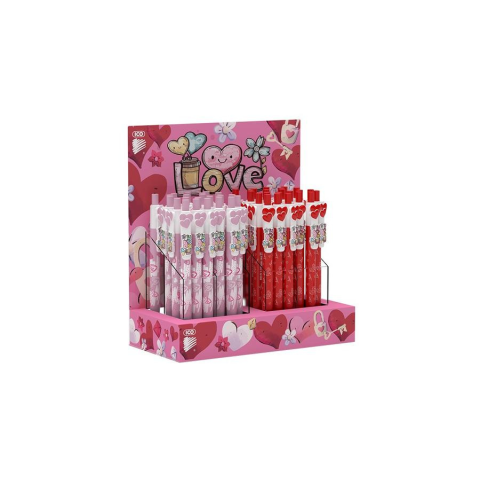 Nyomógombos mechanikával működő golyóstoll, amelyen szívecskés motívumok díszítik tolltestet és LOVE feliratú nyomat a klipszet. Cserélhető X-20-as kék színű golyósbetéttel. Írásvonalvastagság: 0,8 mm.
