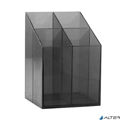 Asztali írószertartó szögletes kivitelben, 4 tárolórekesszel. Választható színek: szürke, transzparens kék, transzparens fekete. Feltöltés nélkül!